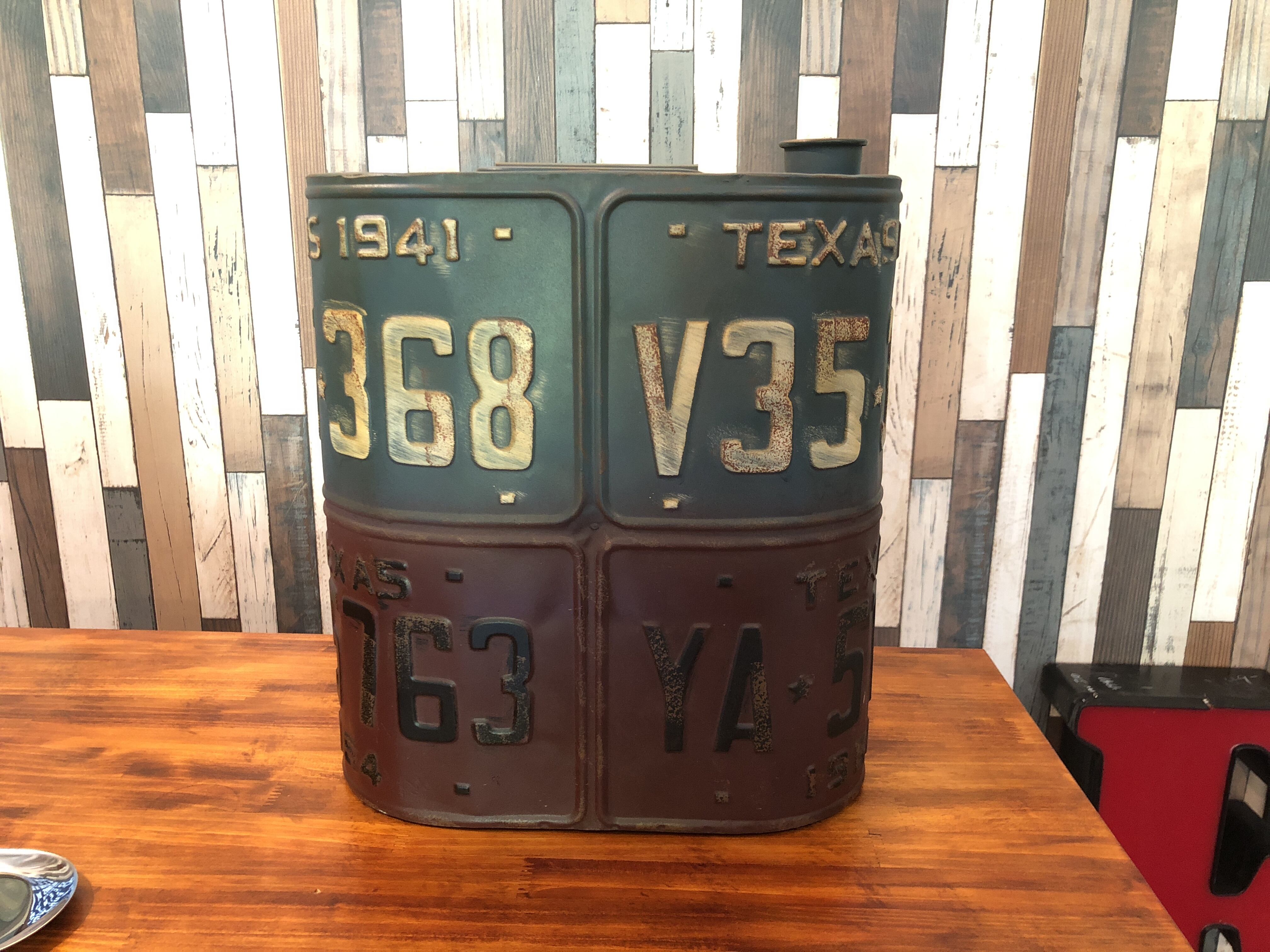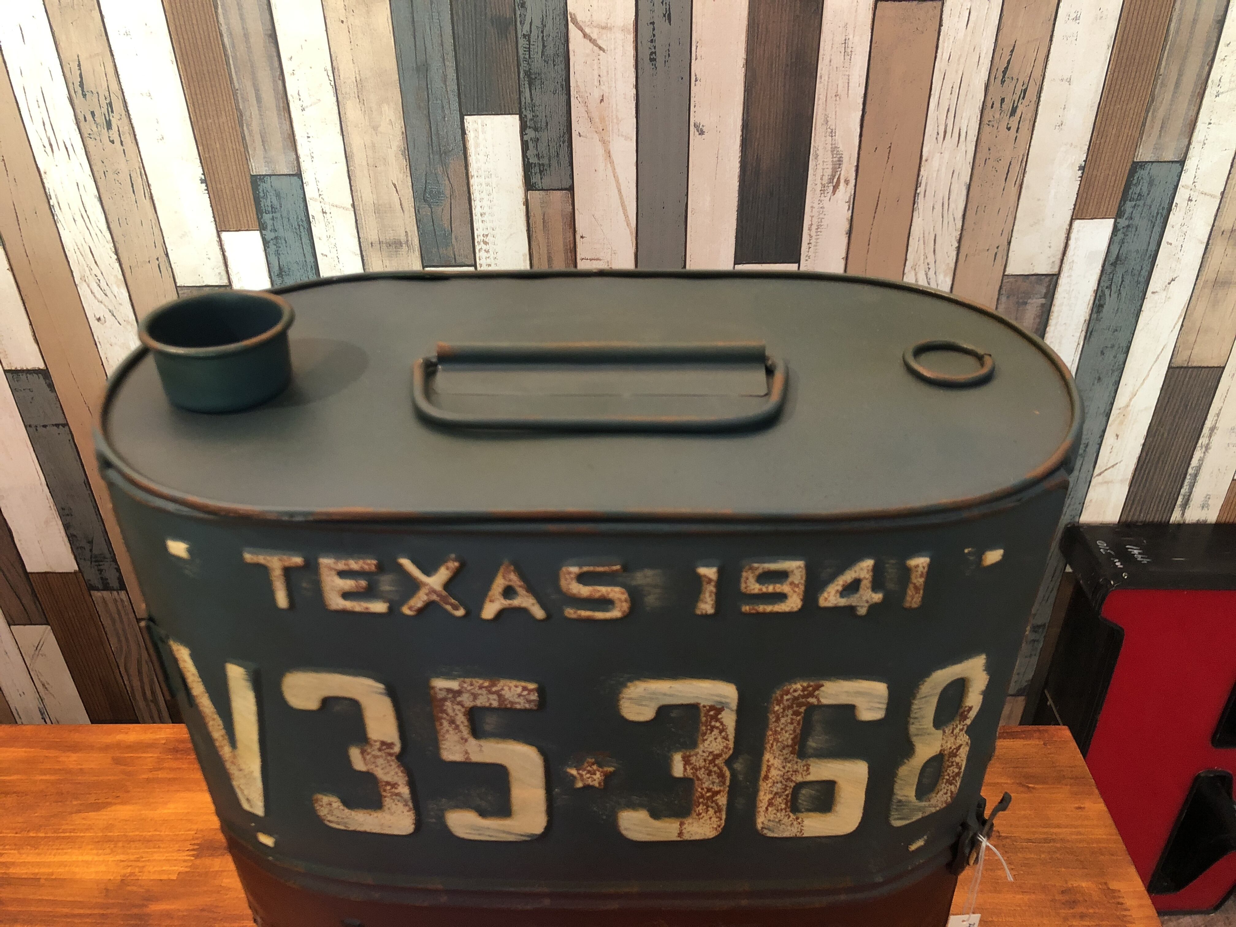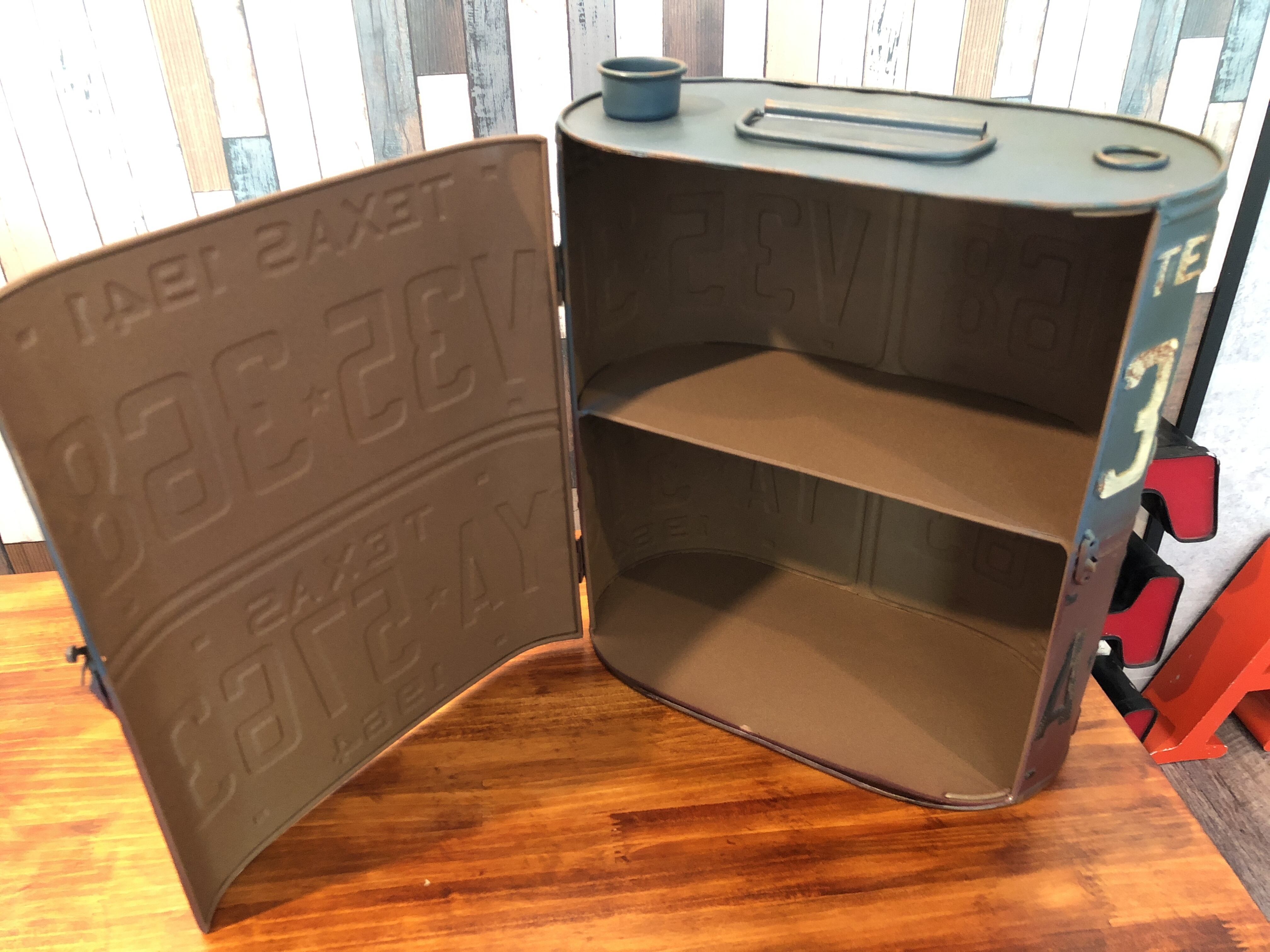 ナンバープレートを合わせて作ったようなオイル缶デザインのストレージBOX。