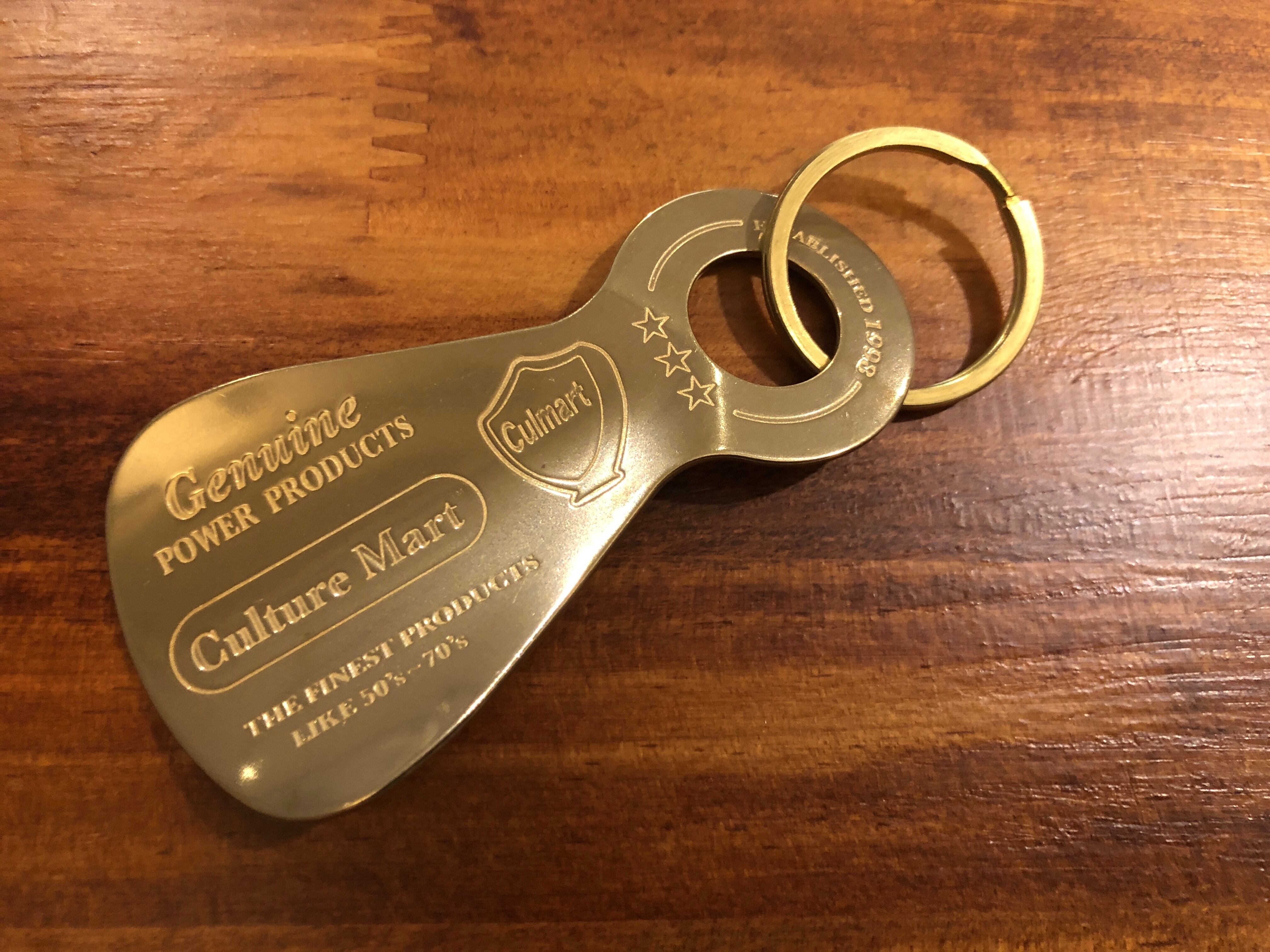 カルチャーマートの刻印の入った靴べら型キーリング。